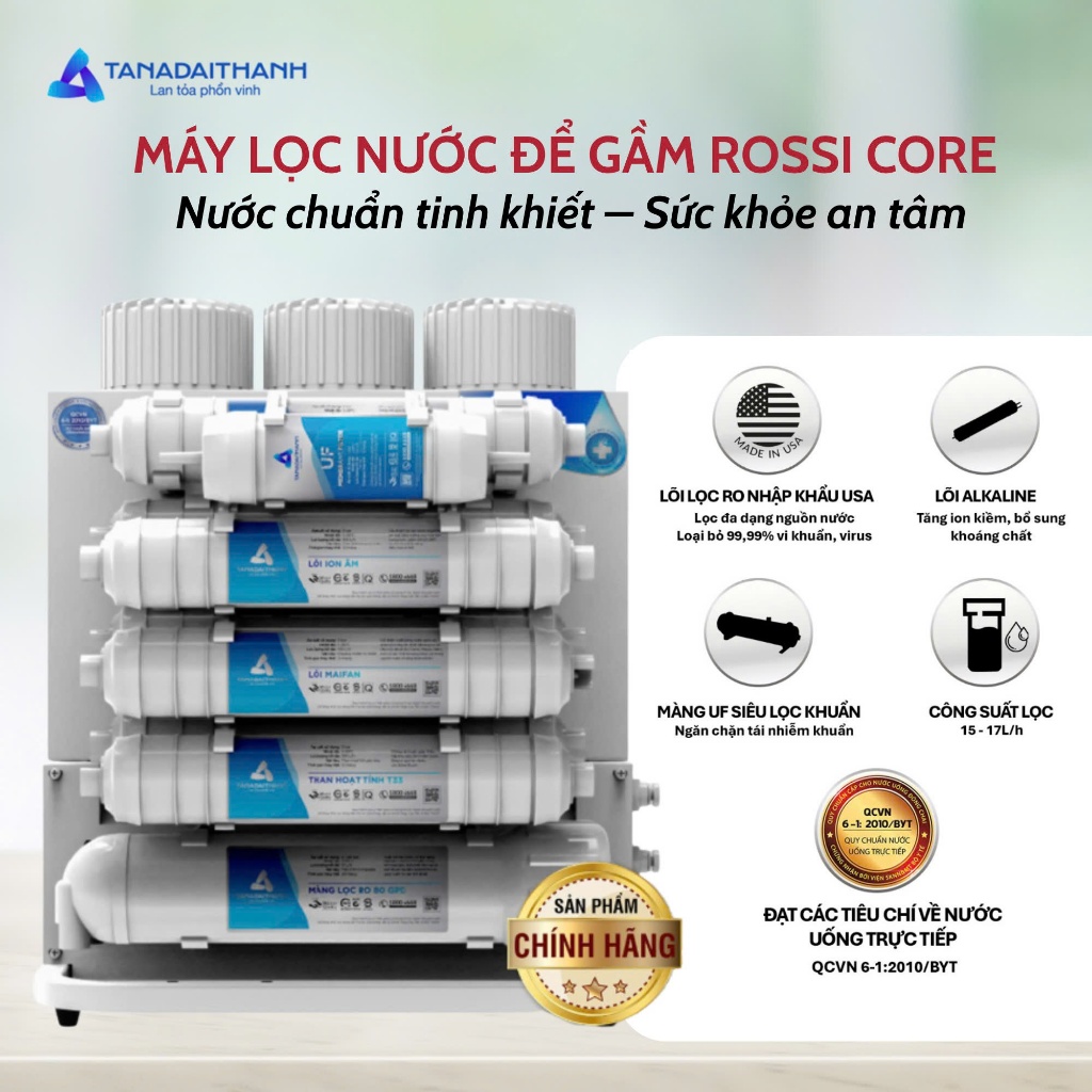 Máy lọc nước RO Rossi Core – Sản phẩm cao cấp của Tập đoàn Tân Á Đại Thành, với các đặc điểm nổi bật: Màng RO FILMTEC nhập khẩu từ Mỹ, lọc sạch khuẩn, loại bỏ đến 99,99% vi khuẩn, virus* Màng siêu lọc NANO SILVER, giúp tiêu diệt vi khuẩn tái sinh, bảo vệ hệ thống lõi