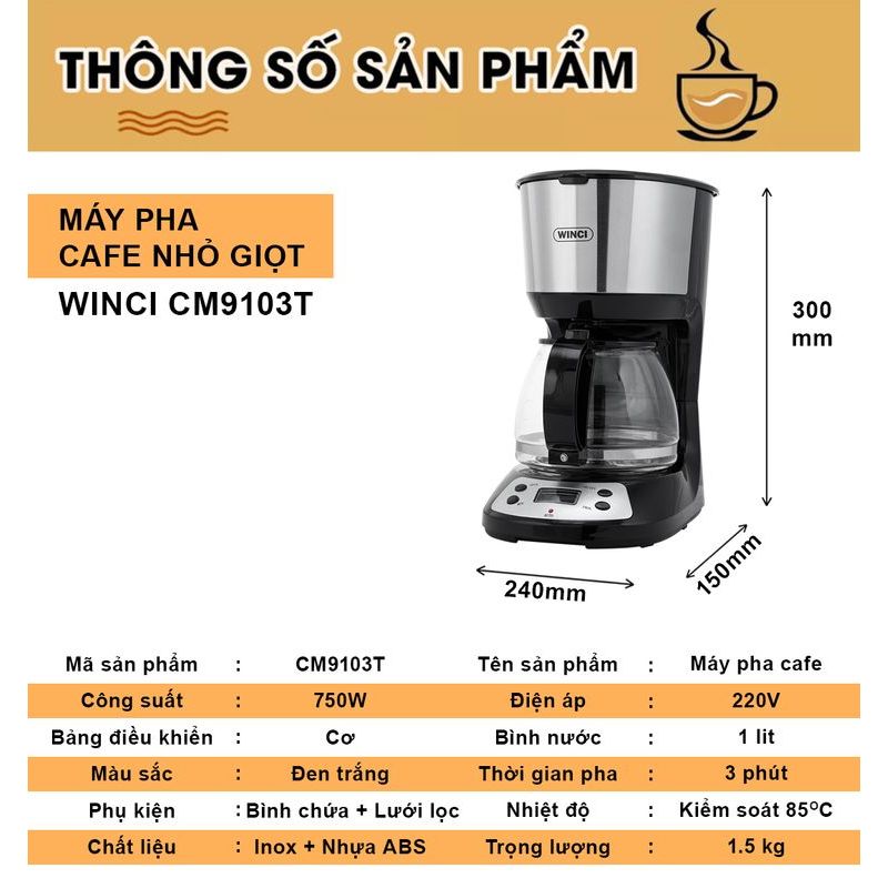 Máy pha cà phê Winci CM9103T dẫn đầu trong dòng máy pha cà phê nhỏ giọt dành cho gia đình, pha chế hoàn toàn tự động, công suất 750w, thiết kế sang trọng hiệu suất pha đáng kinh ngạc, mang lại những ly cà phê thơm ngon chất lượng vượt trội