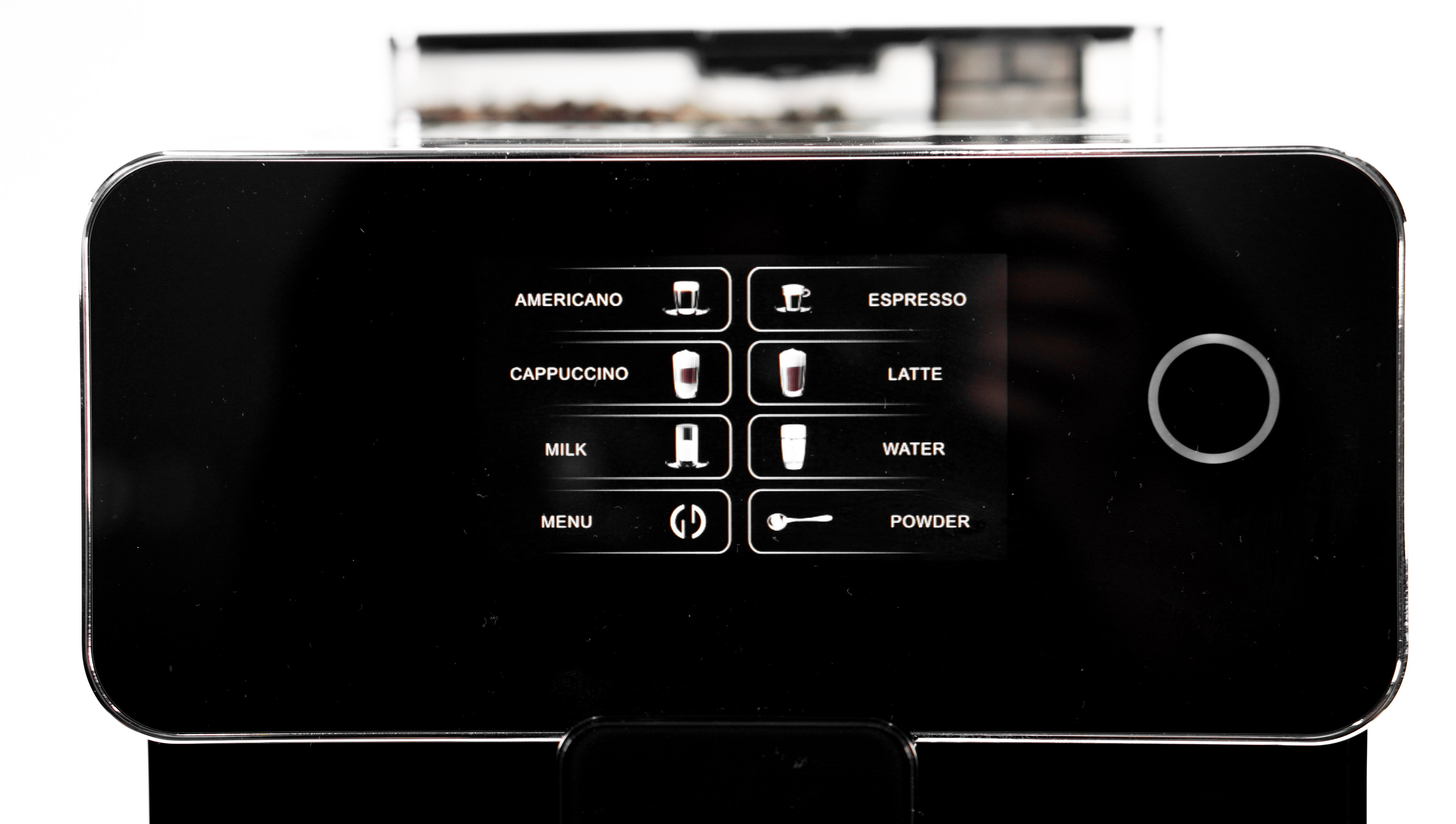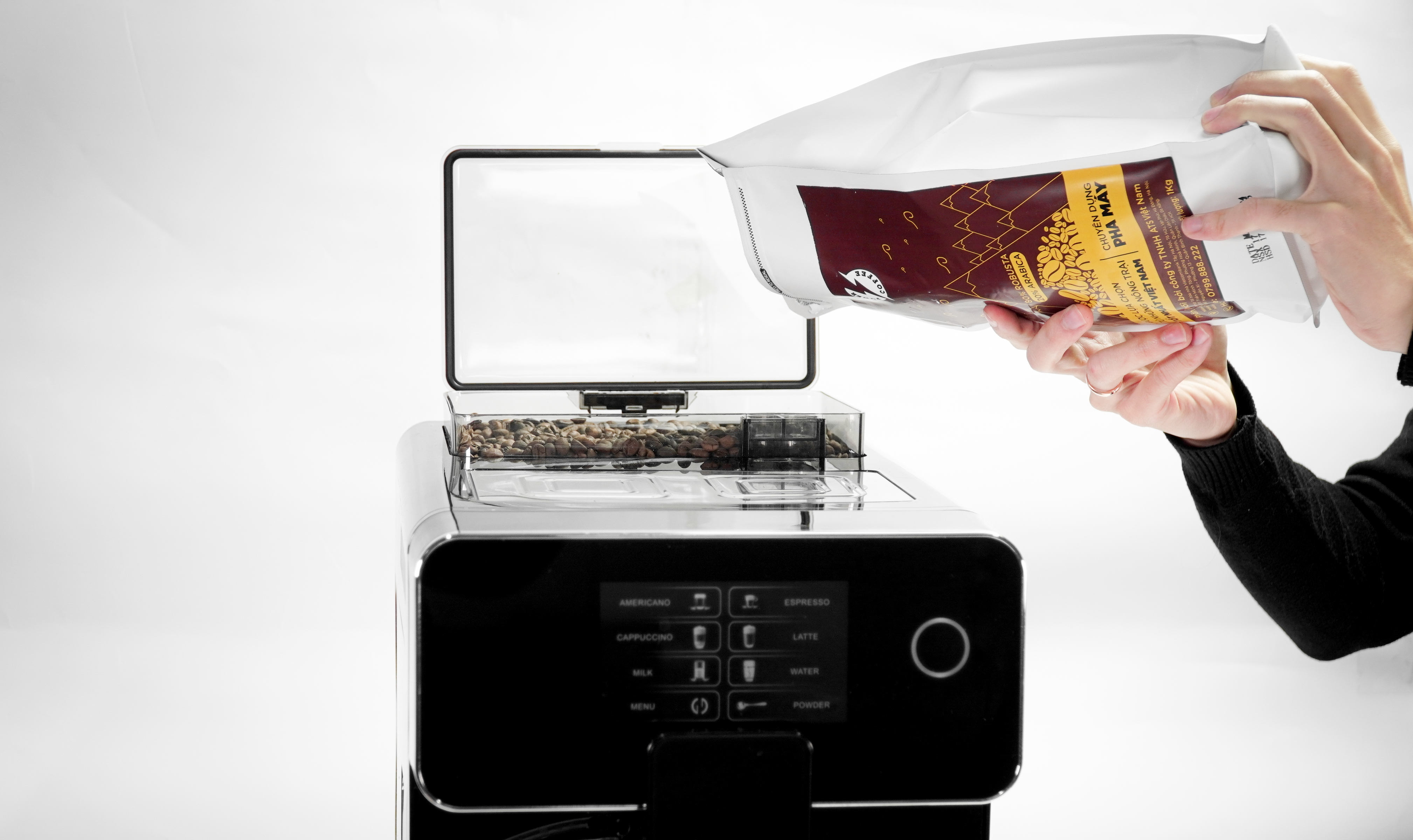 - Pha chế tự động với 6 tùy chọn món: Cho phép người dùng lựa chọn các loại đồ uống khác nhau bao gồm espresso, americano, cappuccino, latte, milk, water