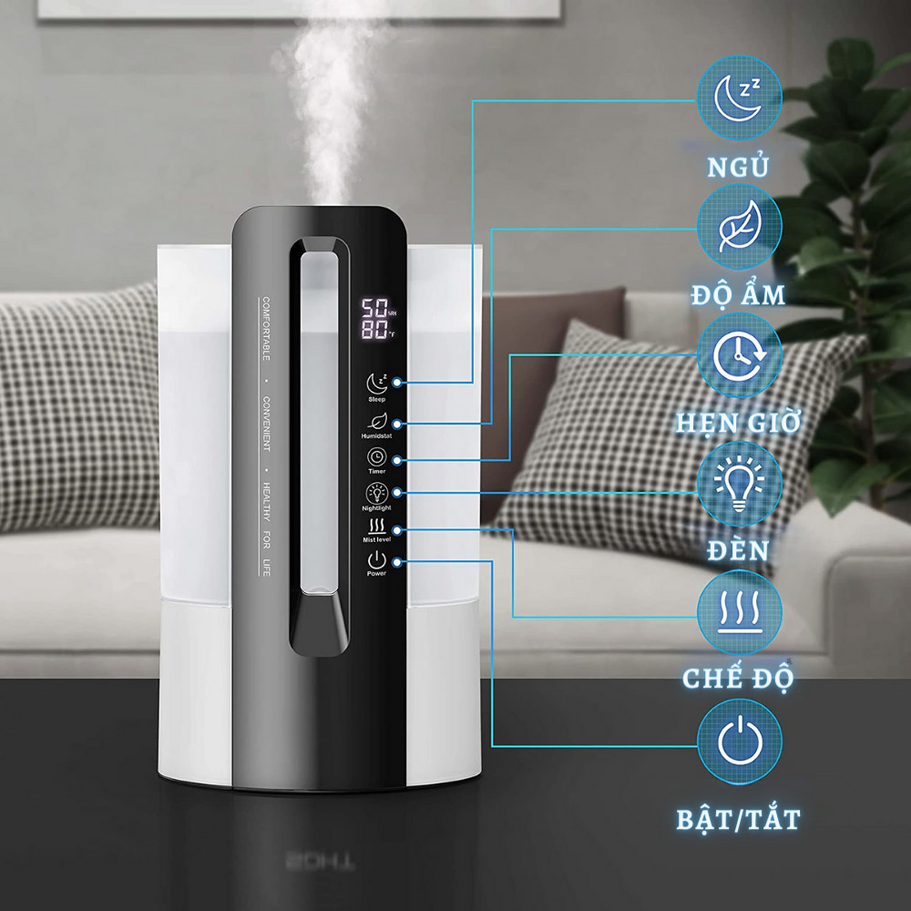 Tính năng nổi bật: Đèn ngủ với 3 mức phun sương, diệt khuẩn nước bằng tia UV, điều chỉnh độ ẩm phù hợp theo nhiệt độ môi trường, có điều khiển từ xa và chế độ ngủ, dễ dàng lấy nước. Tự động ngắt khi thiếu nước, cảm biến nhiệt ẩm chính xác.