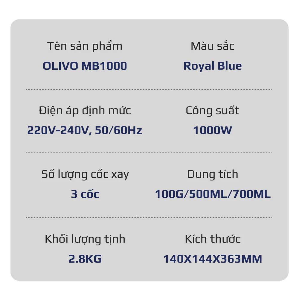 Với OLIVO MB1000, bạn có thể thoải mái sáng tạo các món sinh tố, nước ép, sữa hạt hay các loại sốt, súp và món ăn bổ dưỡng cho gia đình. Đây là sự kết hợp hoàn hảo giữa công suất mạnh mẽ, tính năng đa dạng và độ bền vượt trội, xứng đáng là lựa chọn hàng đầu cho mọi căn bếp hiện đại.
