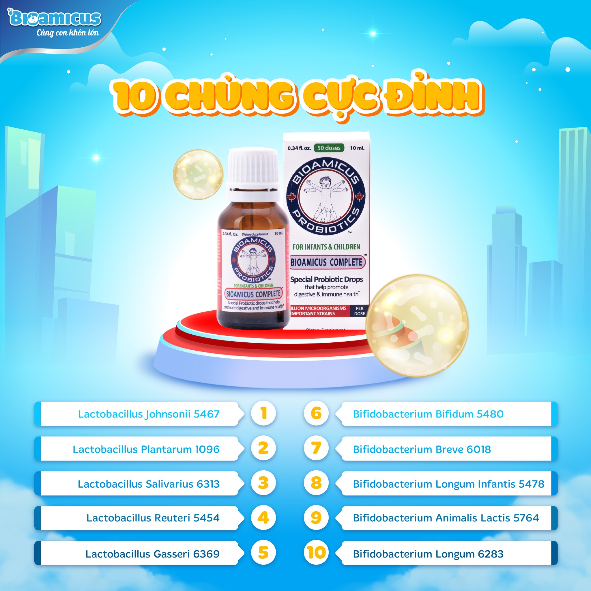 - BioAmicus Complete là công thức đột phá đầu tiên trên thế giới Chứa 10 CHỦNG lợi khuẩn quan trọng nhất của đường ruột giúp: