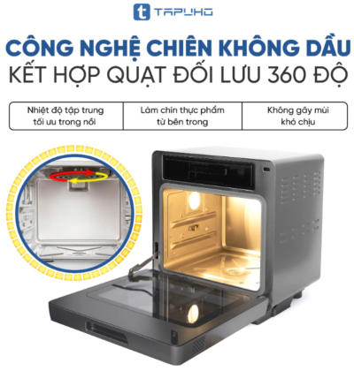 - Sử dụng công nghệ chiên không dầu kết hợp quạt đối lưu, giúp luồng khí nóng tuần hoàn 360° làm chín thực phẩm đều mọi mặt. Công nghệ này giúp món ăn giòn rụm bên ngoài, mềm ẩm bên trong mà không cần dùng dầu mỡ, tốt cho sức khỏe