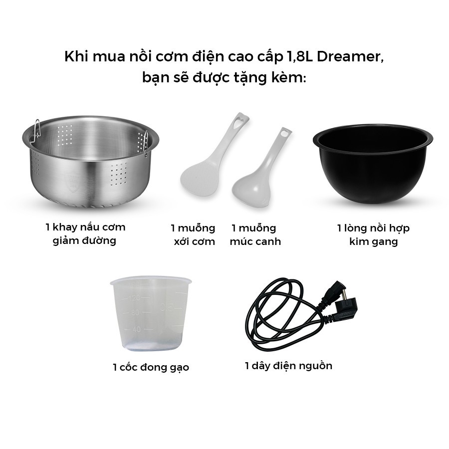 10. PHỤ KIỆN ĐI KÈM Khi mua nồi cơm điện cao cấp 1,8L Dreamer, bạn sẽ được tặng kèm: - 1 khay nấu cơm, 1 dây điện nguồn, 1 muỗng xới cơm, 1 muỗng múc canh, 1 cốc đong gạo