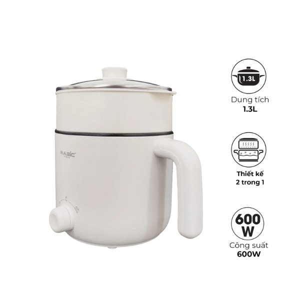 - Nồi lẩu đa năng Magic A-040 dung tích 1.3L phù hợp cho cá nhân hoặc gia đình 1–2 người.