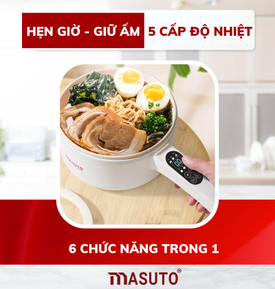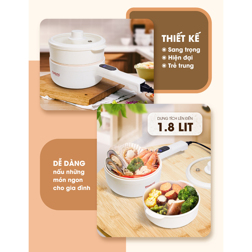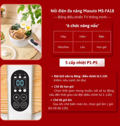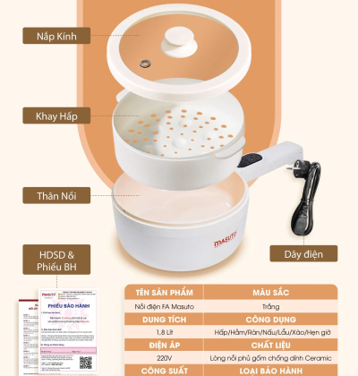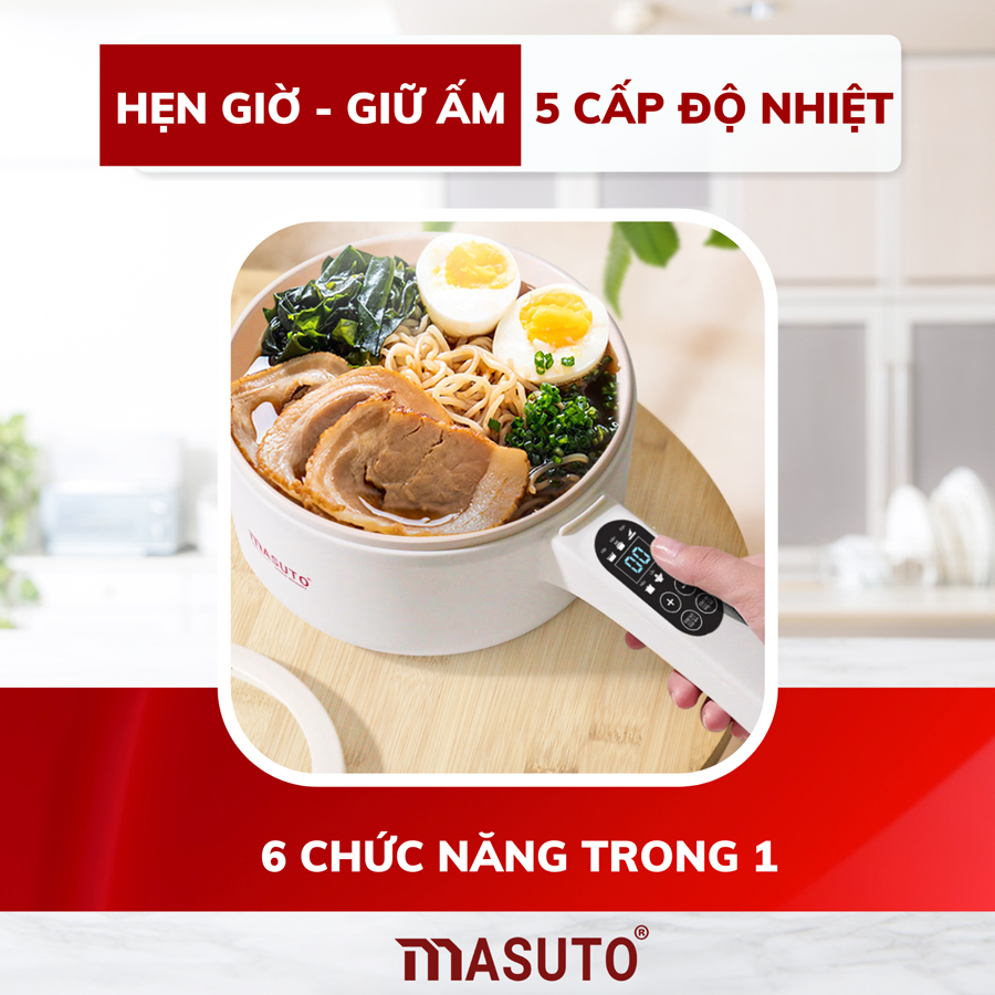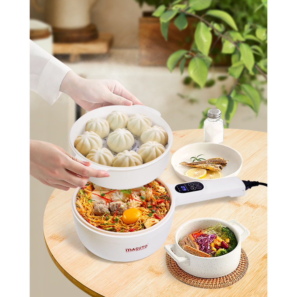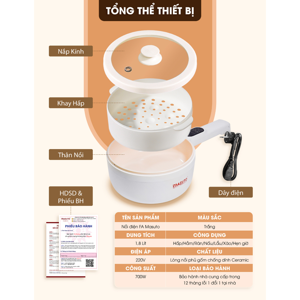 Nồi Lẫu Điện Đa Năng 2 Tầng Masuto 6in 1 MS-FA18 - Nồi Lẩu Điện Đa Năng - Dung Tích 1,8L - Đáy Vân Đá Cremic Siêu Chống Dính