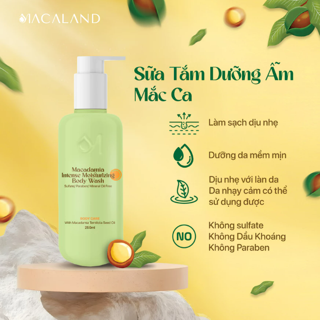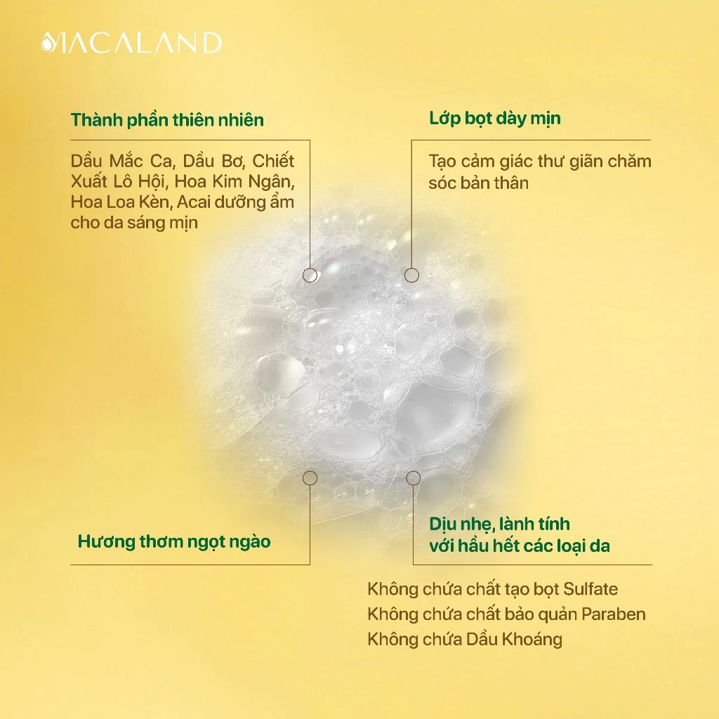 Sữa Tắm Dưỡng Ẩm Macaland 250ml/500ml Mắc Ca Không Sulfate, Cấp Ẩm, Dưỡng Da Sáng Mịn