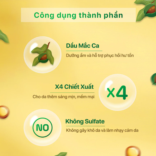 Anti-oxidants, Không chứa paraben, Không chứa sulfate, Dầu Mắc Ca