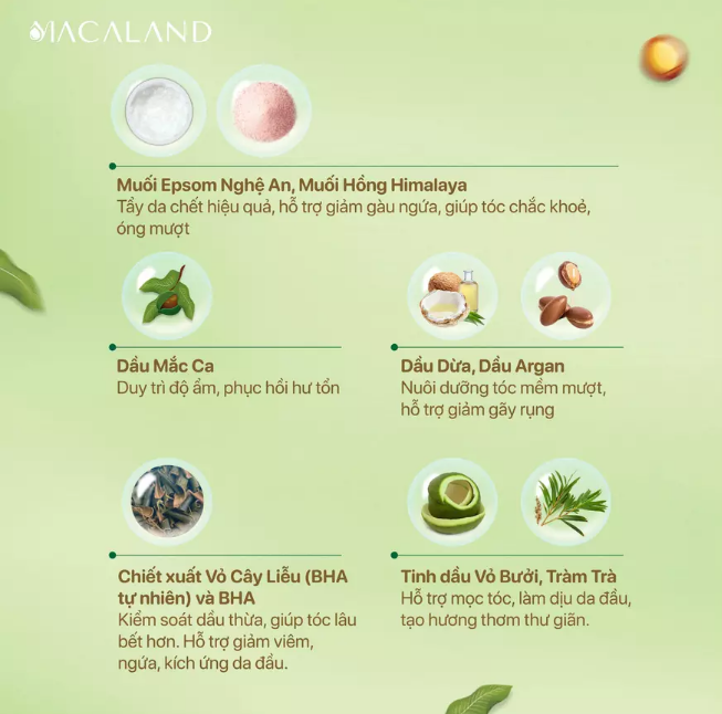 Với hàm lượng cao Dầu Mắc Ca có khả năng dưỡng ẩm và phục hồi hư tổn, cùng Muối Epsom giúp tẩy da đầu hiệu quả, hỗ trợ giảm gàu ngứa, kích ứng, Macaland hy vọng Tẩy tế bào chết da đầu sẽ mang đến một sản phẩm chất lượng đến với người tiêu dùng, đồng thời lan toả sứ mệnh tận dụng tối đa nguồn nguyên liệu thiên nhiên một cách bền vững.