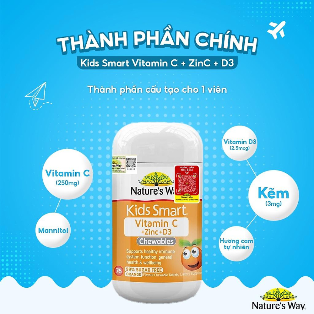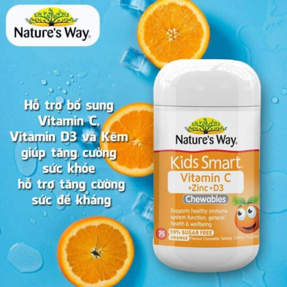Viên nhai Vitamin C + Kẽm + D3 Nature's Way Kids Smart, hộp 75 viên, tăng miễn dịch, hỗ trợ trẻ em