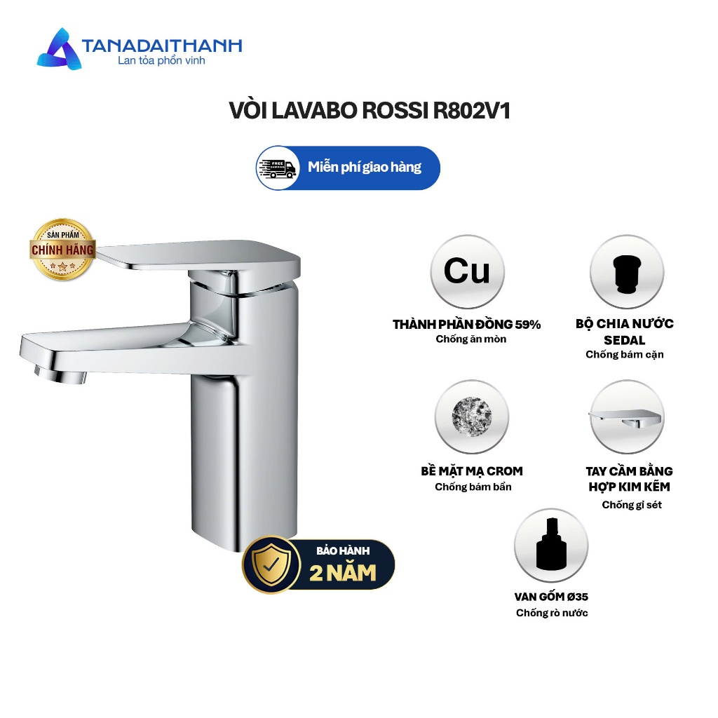 Là sản phẩm được chế tạo từ chất liệu đồng 59%, vòi chậu Rossi R802V1 sở hữu nhiều đặc điểm nổi bật như: khả năng chống ăn mòn, hạn chế bám cặn, chống hoen gỉ, độ bền sản phẩm cao, đồng thời, đảm bảo chất lượng nguồn nước, an toàn cho sức khỏe người sử dụng.