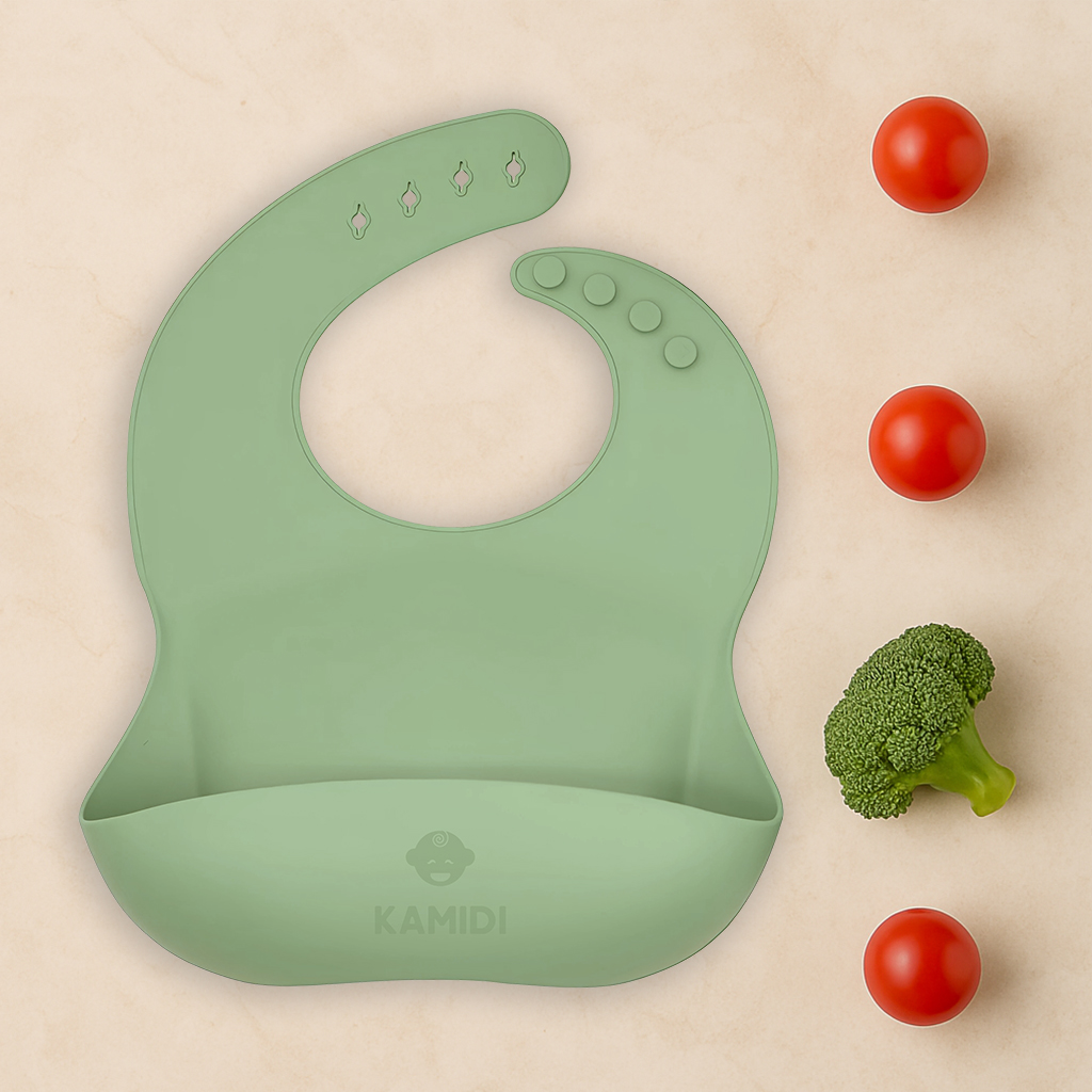 Yếm Silicone Kamidi mềm mại, chống tràn, giúp bé ăn thoải mái mà không lo dây bẩn. Chất liệu an toàn tuyệt đối – mẹ yên tâm, bé sạch sẽ!